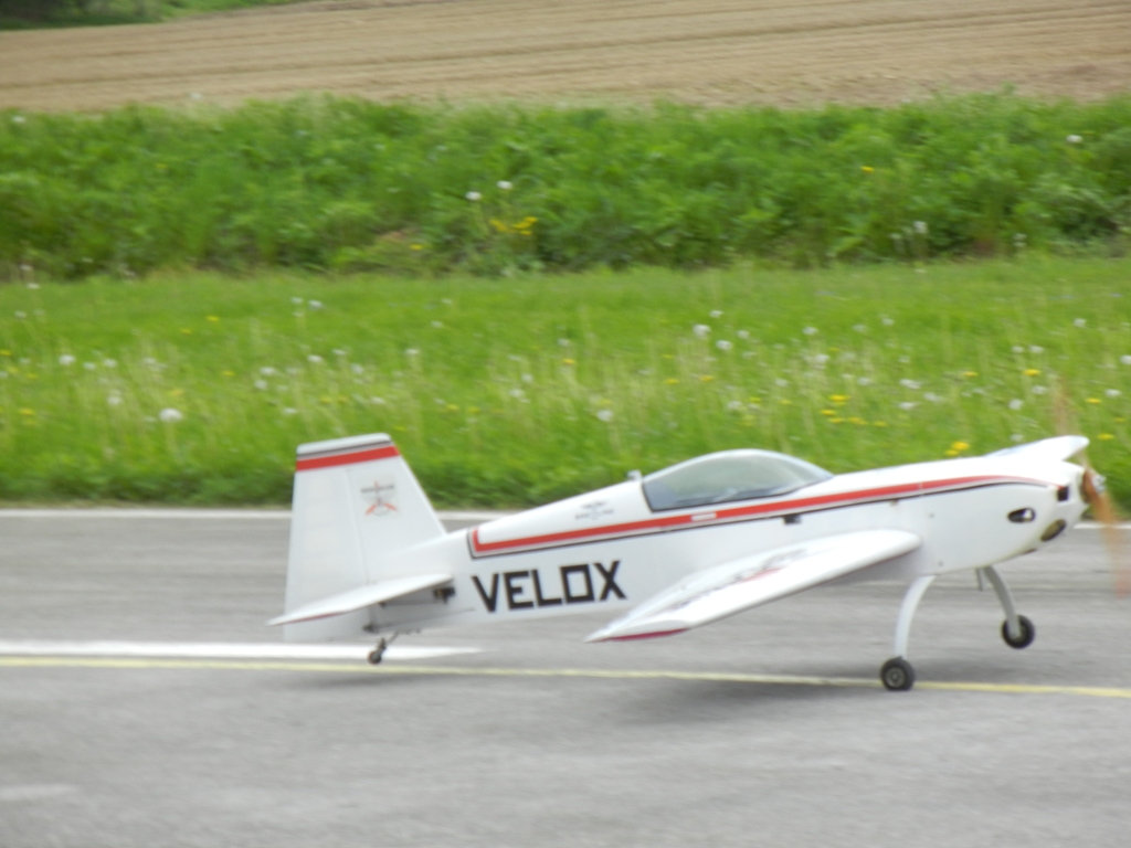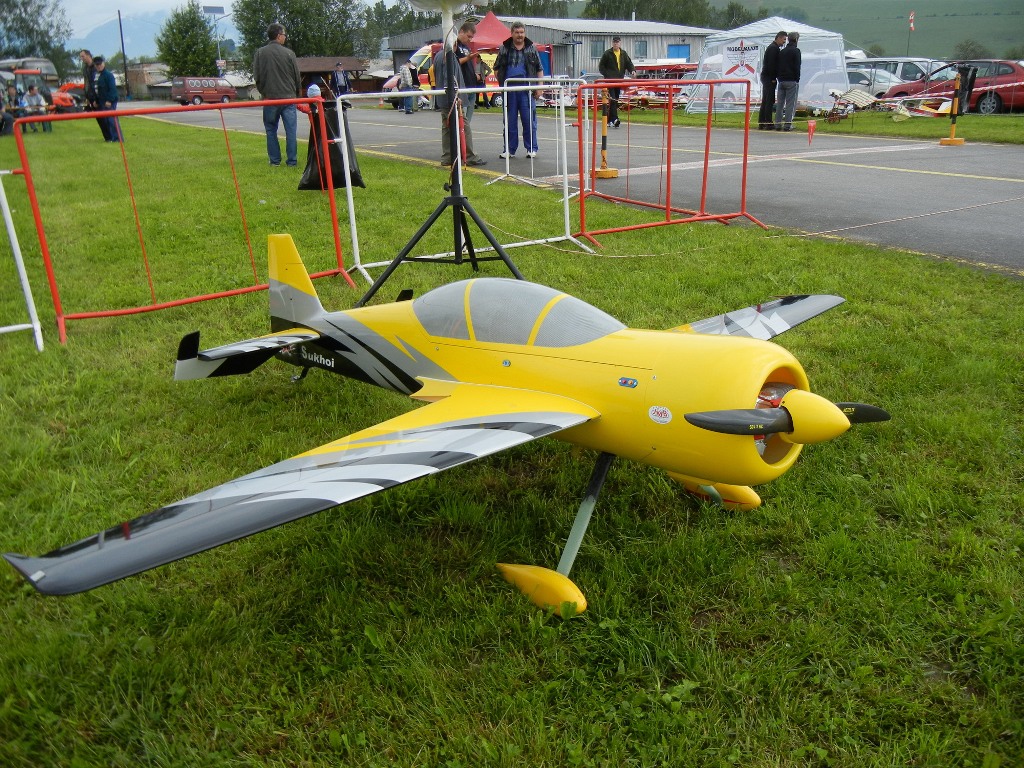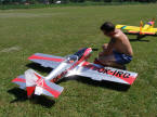 Po slávnostnom otvorení podujatia majiteľom letiska Ing. Miroslavom Tomom a úvodnom brífingu, letovú činnosť zahájil domáci Honzo Procházka s modelom Stinson Reliant (rozp. 2,5m, motor Titan 38ccm). Keďže akrobatov – klasických aj 3D – bolo zase dosť, chcel by som predovšetkým vyzdvihnúť také tie „iné“ akrobatické ukážky – hlavne kde bola evidentná maximálna snaha priblížiť akrobatický let modelu svojej veľkej predlohe. Tejto úlohy sa zhostil napríklad Gabriel Karaba so svojím Pittsom S1 v mierke 1:2, poháňaným motorom Valach 170 ccm. Špecifickou ukážkou bolo skupinové vystúpenie Braňa Dudáša a Tibora Bekeša s naozaj obrími modelmi akrobatickej verzie lietadla Belanca Super Decathlon. Modely majú rozpätie krídel 4,6m a sú poháňané motormi DA 170ccm. Piloti predvádzali skupinovú zlietanosť s akrobatickými prvkami – skvelé vystúpenie a domov si odniesli ocenenie za Najväčší model. Medzi akrobatické letové ukážky (aj keď bez revu motora, ale o to pôsobivejšie) možno zaradiť vystúpenie Ivana Čániho s modelom legendárneho vetroňa LF-107 Luňák (rozp. 4,25m), ktorý bol pre zvýraznenie letovej stopy vybavený na koncoch krídel dymovnicami. Akrobaciu na hudbu predvádzal Ivo Caha z Třebíče zo svojím 2,6m Veloxom Evolution. Žiaľ, pri svojom druhom lete, počas predvádzanej zostavy prestal model reagovať na povely pilota a pod plným plynom skončil svoj let tvrdým nárazom do blízkeho poľa. Táto „totálka“ tak priniesla nešťastnému pilotovi titul Smoliar podujatia.