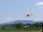 Naše letové ukážky sme si odbyli po jednej doobeda a druhýkrát popoludní. Celkom sa darilo a ukážky vyzeraly dobre. Vo svojom druhom vystúpení mal trocha smoly Miško, ktorému v súvratu zhasol motor a musel núdzovo pristať do vysokej kukurice. Našťastie modelu sa nič nestalo, len stralil niekde v kukurici vzperu výškovky a tak ďalšie vystúpenie už nemohol absolvovať. Celý deň bolo nebo bez jediného mráčika a na letisku bola tzv. "tropicana". Teplomery v autách ukazovaly vyše 35°C. Veľmi dôsledne sme dodržiavali pitný režim a tak sa nám podarilo celý deň preskákať bez následkov.